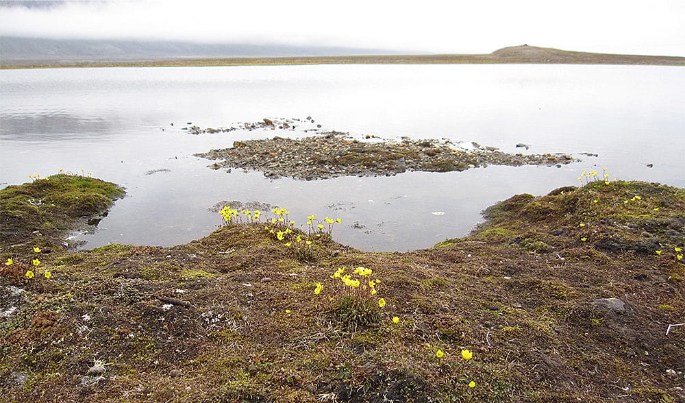 The dominant bodies of water are shallow (<2 m) ponds and small lakes created by permafrost. These often have a high production of insects and crustaceans, may be significant biotopes for birds, and are highly vulnerable to permafrost thawing. These permafrost-dammed pools do not normally support fish since they freeze through to the bottom in winter, whereas Arctic char live in effectively all the lakes in Svalbard below the marine limit that do not freeze through (are deeper than 2 m).