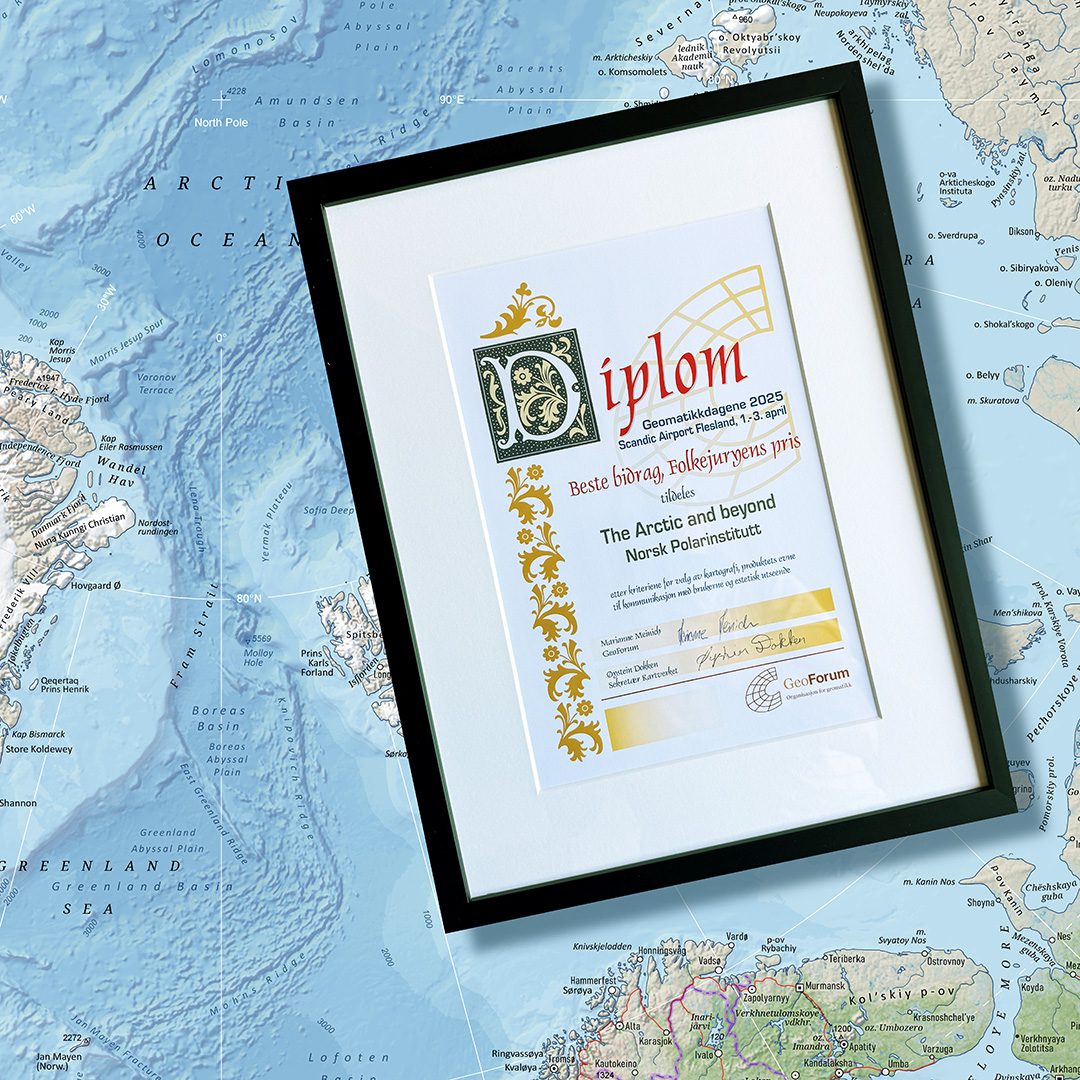 Det ferske Arktis-kartet “The Arctic and beyond” fekk «folkejuryprisen» under dei årlege Geomatikkdagane, som er Noregs største uavhengige konferanse om teknologi, data og løysingar som bruker geografisk informasjon. I år blei konferansen halde i Bergen.