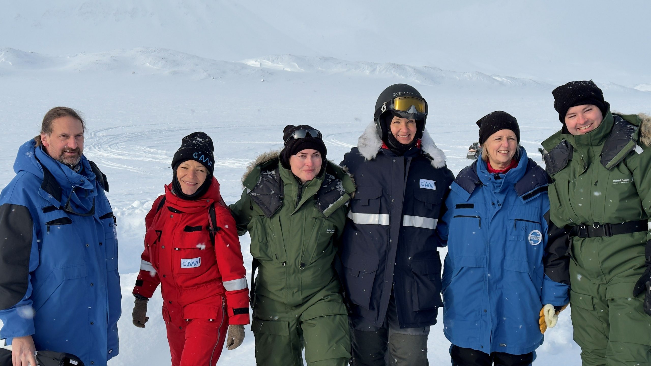 Fra venstre: Yan Ropert-Coudert (direktør IPEV), Antje Boetius (direktør Alfred Wegener Institute), Camilla Brekke (direktør i Norsk Polarinstitutt), Bettina Stark-Watzinger (forsknings- og utdanningsminister Tyskland), Sylvie Retailleau (forsknings- og utdanningsminister Frankrike) og, Sindre Lysø (statssekretær i Kunnskapsdepartementet, AP). Foto: Geir Gotaas, Norsk Polarinstitutt