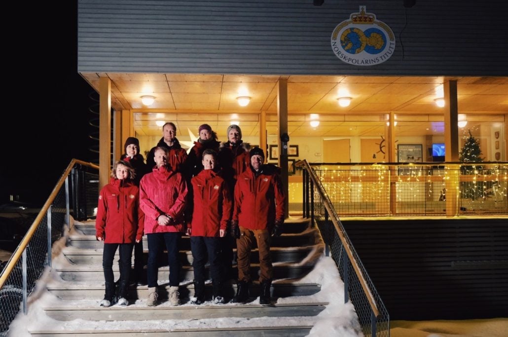 Våre folk i Ny-Ålesund i jula, frå venstre: Dagmara Wojtanowicz (feltteknikar), Arnt Rennan (vikarleiar Sverdrup), Kristian Alme (driftsingeniør) og Rune Jensen (vikarleiar Sverdrup). Bak frå venstre: Fieke Rader (forskingskoordinator), Jan Ivar Pettersen (logistikleiar), Gulli Aarnes (driftsingeniør) og Lars Erik Sørgård (driftsingeniør). Foto: Matteo-Mariano Chirico