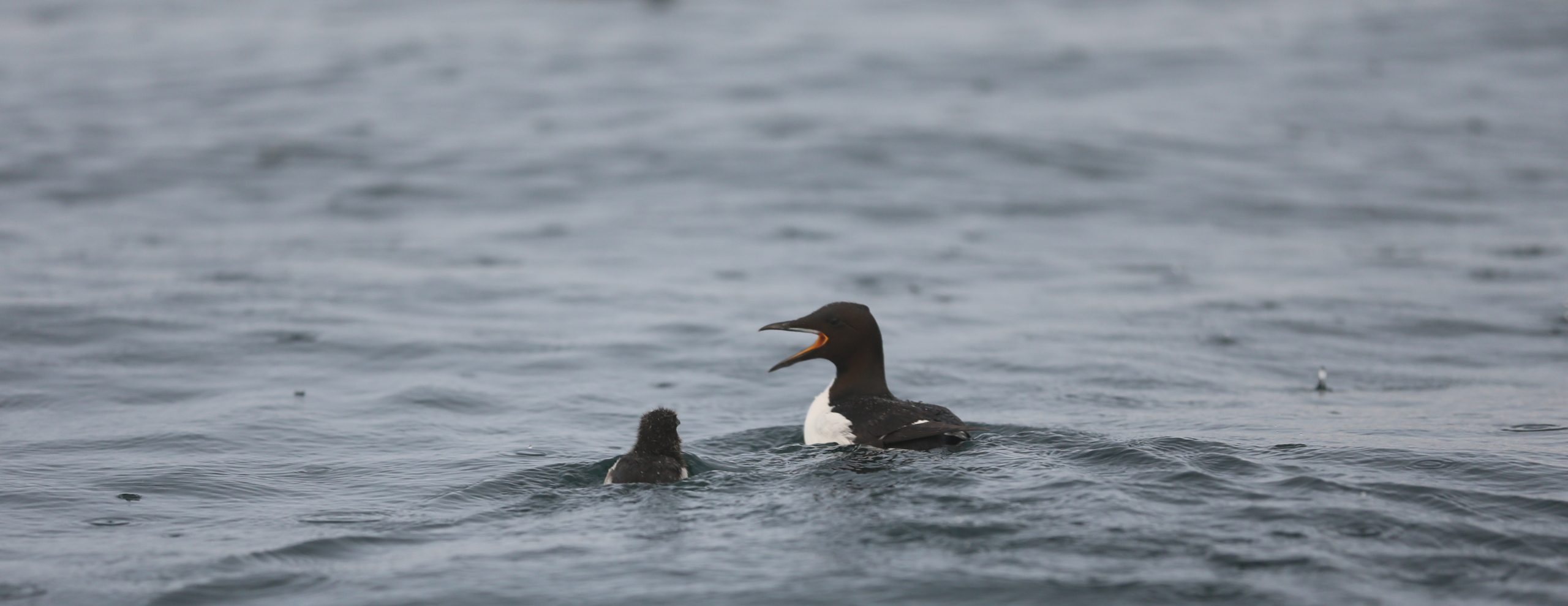 Den vesle lomvifamilien padler med svømmeføttene sine fra kolonien på fjellet. De krysser sterke strømmer, mens de dykker etter småfisk og krepsdyr, og gjemmer seg under vann når det kommer angrep fra lufta.