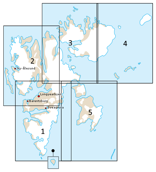 FEM KARTBLAD Kartserien Svalbard (S250) består av fem kartblad som viser terrenget på jordoverflata. Naturlege og menneskeskapte former er viste, til dømes kystliner, isbrear, vegar og bygningar. Karta viser òg stadnamn og ulike typar grenser. Kart: Norsk Polarinstitutt