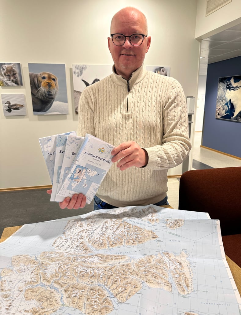 HEILE SVALBARD Topograf Roger Hagerup har leia arbeide med dei nye karta. Karta finns berre i bretta utgåver. Foto: Elin Vinje Jenssen / Norsk Polarinstitutt