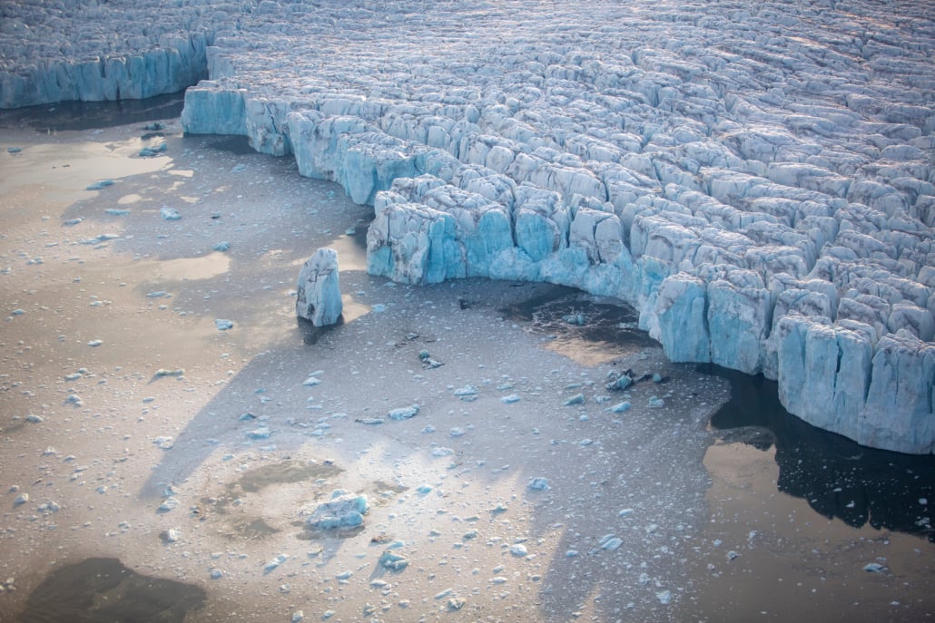 SMELTAR Dei nye Svalbard-karta byggjer på flyfotografering frå perioden 2008–2012, kombinert med ferske satellittdata frå 2024 for brefrontane. Dei sistnemnde data viser tydelege endringar i brefrontar – som er markerte med stipla linjer i karta. Bilete er frå Sonklarbreen på Olav V Land på Svalbard. Foto: Samuel Martínez Llobet / Norsk Polarinstitutt