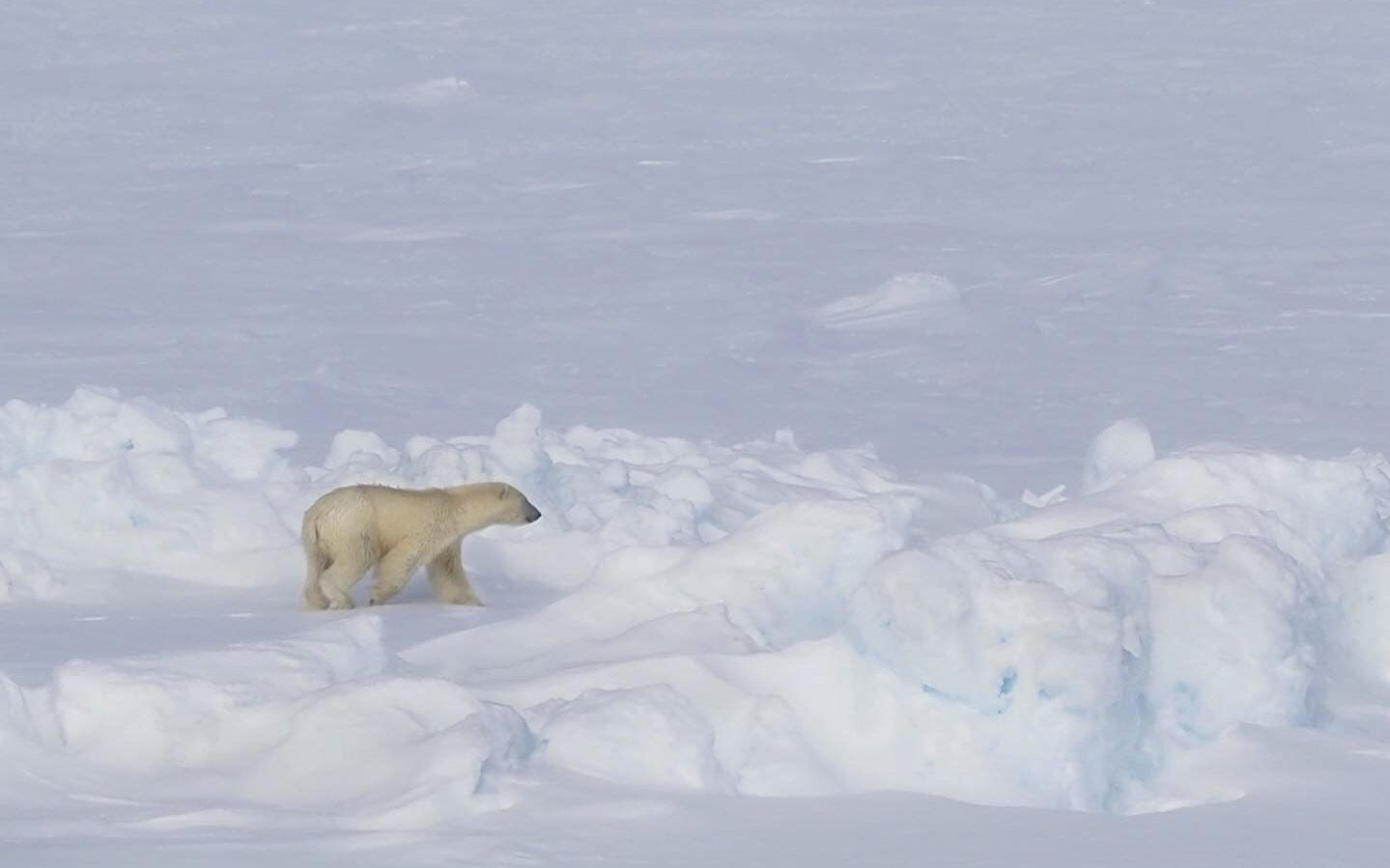 Situasjonen ble annerledes på siste isstasjon. En isbjørn dukket plutselig opp et øyeblikk bak en skrugard. Bjørnen ble oppdaget av en i teamet på havisen, og ikke av folka på brua. Det ble varslet, og bjørnen som forsvant like fort som den ble spottet ble fulgt med på, -noe som var utfordrende da den bare dukket opp i korte glimt. Det kunne vært en isbjørn som hadde sneket seg innpå forskerne, i skjul av skrugarder, eller det kunne være en som hadde sovet sin søteste søvn og ble vekket av liv og røre på isen. Uansett, – bjørnen trakk seg hurtig unna, og forsvant i det fjerne.