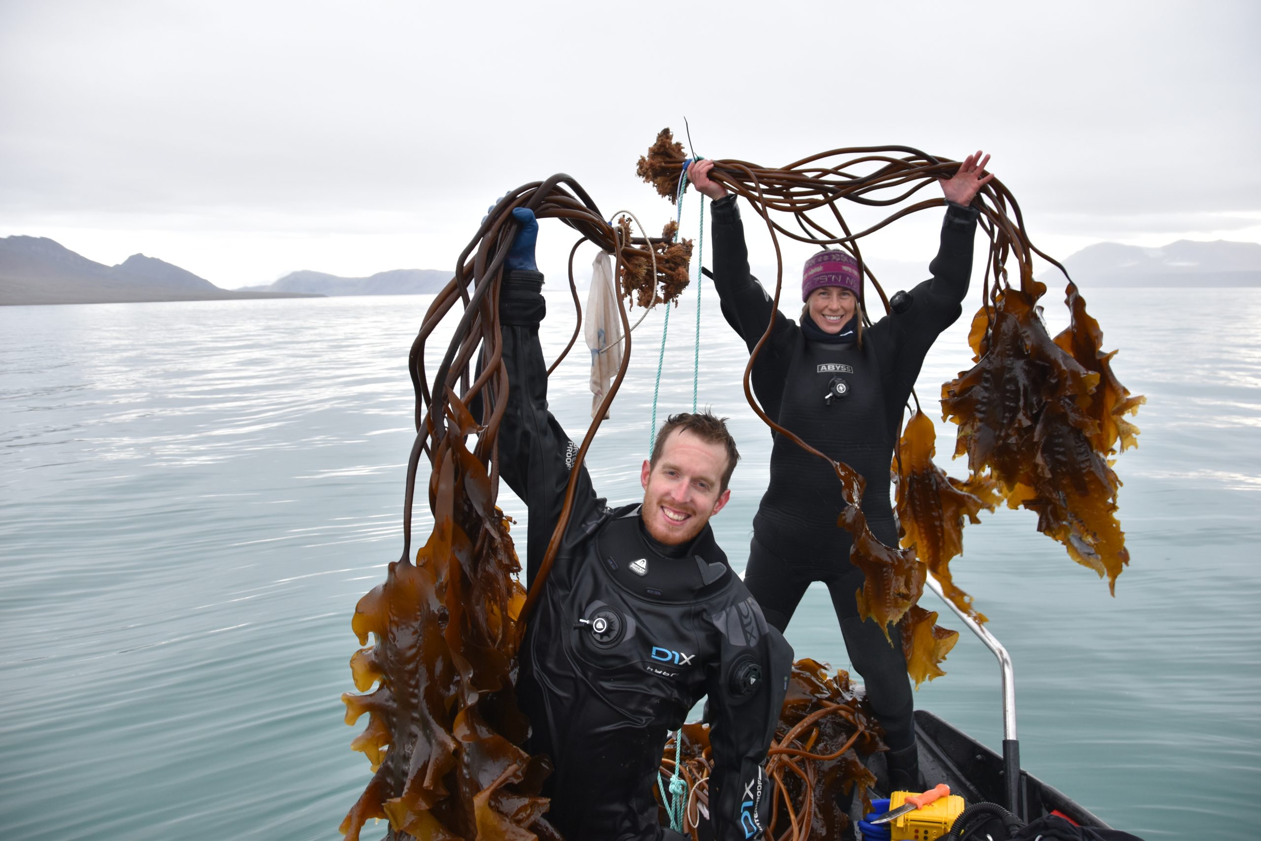 Albert og Karen med samlinger av stor sukkertare (Saccharina latissima). Foto: Haakon Hop / Norsk Polarinstitutt
