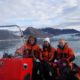 GRØNLANDS-ESKPEDISJONEN Geolog og polarforsker Brit Hofseth på brua ombord på skipet Polarbjørn før avreise til Grønland. Her er hun sammen med den svenske glasiologen Hans W. Ahlmann (t.v.), en ekspedisjonsdeltaker (ukjent navn) og romanforfatteren Nils Johan Rud. Foto: Ebbe Arneberg / Norsk Polarinstitutt